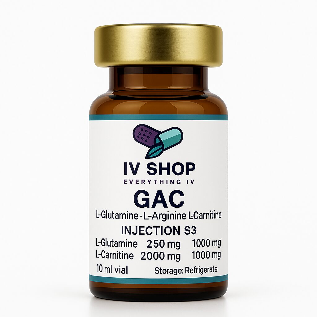 GAC Amino Blend (Glutamine + Arginine + Carnitine) • 10 mL sterile vial for IV use under professional supervision.