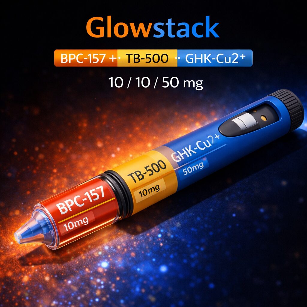 Glowstack is a premium triple-compound peptide formulation uniting regenerative peptides BPC-157 and TB-500 with copper peptide GHK-Cu2+, widely utilised in clinician-supervised protocols targeting tissue repair, skin integrity, cellular renewal, and aesthetic optimisation.
