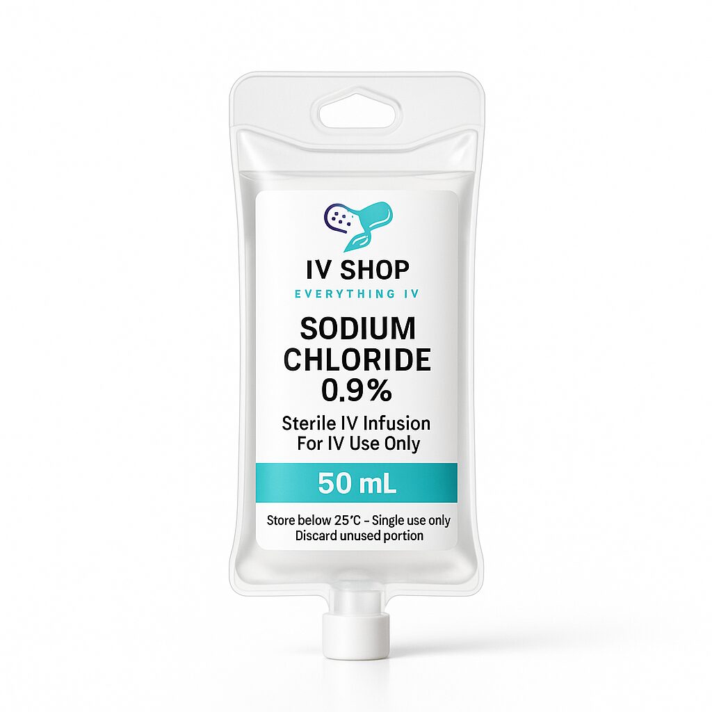 Sodium Chloride 0.9% • 50 mL sterile IV bottle for dilution of injectable medicines and targeted carrier use.